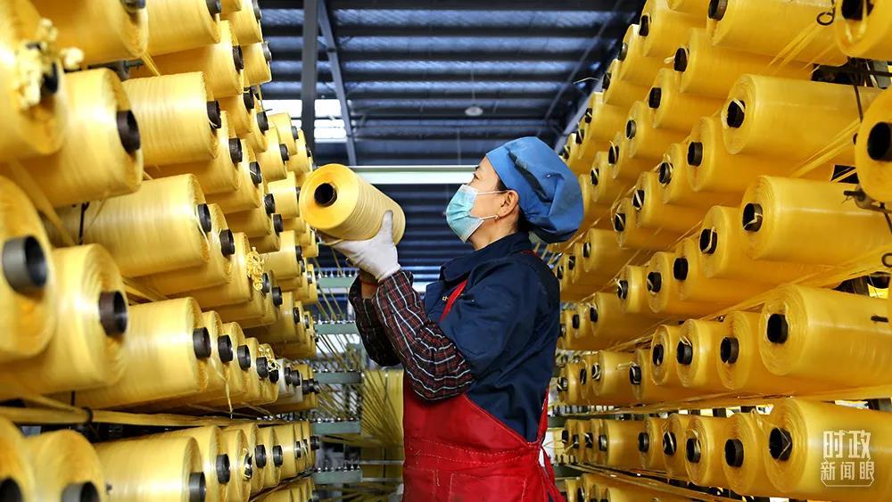△2021年12月,江蘇連云港,工人在“扶貧車(chē)間”生產(chǎn)加工編織袋。(圖/視覺(jué)中國(guó))