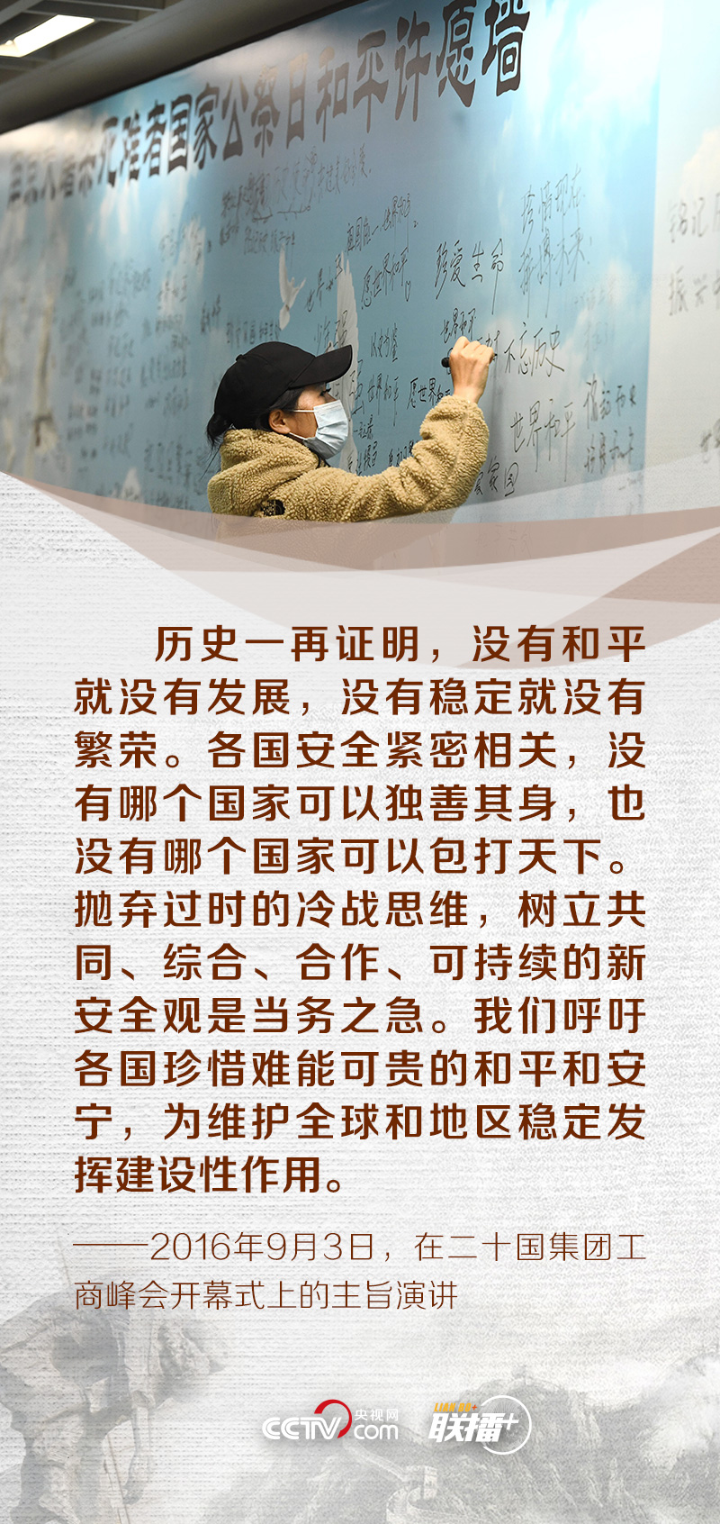 “歷史不會因時代變遷而改變,事實也不會因巧舌抵賴而消失。”“和平像陽光一樣溫暖、像雨露一樣滋潤。有了陽光雨露,萬物才能茁壯成長。有了和平穩(wěn)定,人類才能更好實現(xiàn)自己的夢想。”2014年、2017年,習近平總書記曾兩次出席南京大屠殺死難者國家公祭儀式。