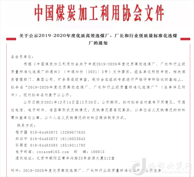 西部決策網(wǎng)訊12月14日,從中國煤炭加工利用協(xié)會傳來喜訊,陜煤集團陜北礦業(yè)檸條塔公司選煤廠榮獲2019-2020年度行業(yè)級質(zhì)量標準化選煤廠。