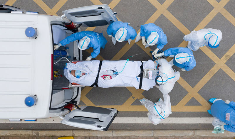 2020年3月6日,在湖北省武漢市的華中科技大學附屬同濟醫(yī)院中法新城院區(qū),醫(yī)護人員用負壓救護車轉(zhuǎn)運一位新冠肺炎患者做CT檢查(無人機照片)。