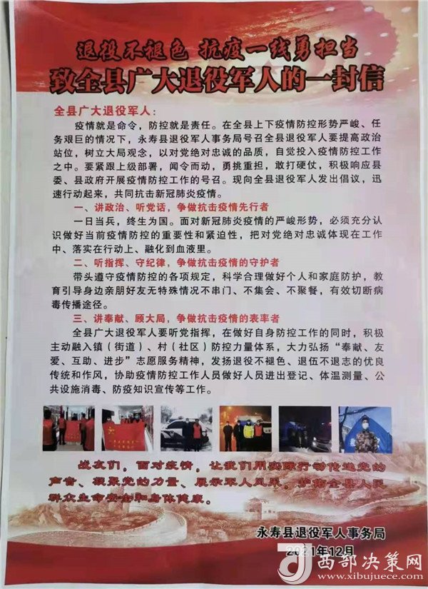 12月24日,永壽縣退役軍人事務局向全縣廣大退役軍人發(fā)出了《退役不褪色,抗疫一線勇?lián)敗返囊环庑?,倡議一發(fā)出,志愿者們紛紛主動請纓,聯(lián)名遞交了疫情防控一線作戰(zhàn)的請戰(zhàn)書。連夜集結,在永壽縣退役軍人事務局召開了“抗擊疫情沖鋒在前”退役軍人志愿者誓師動員大會,局主要負責同志向廣大退役軍人志愿者作了戰(zhàn)前動員,大家激情高漲,“必勝、必勝、必勝”的口號響徹整個大樓,用實際行動堅守在疫情防治的第一線。