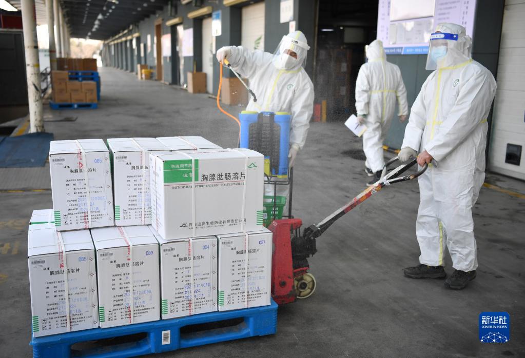 12月28日,陜藥集團派昂醫(yī)藥公司工作人員對即將入庫的藥品進行消殺。新華社記者 邵瑞 攝