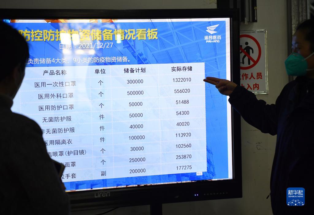 12月28日,陜藥集團派昂醫(yī)藥公司工作人員在查看倉庫內(nèi)的疫情防控防護物資儲備情況。新華社記者 邵瑞 攝
