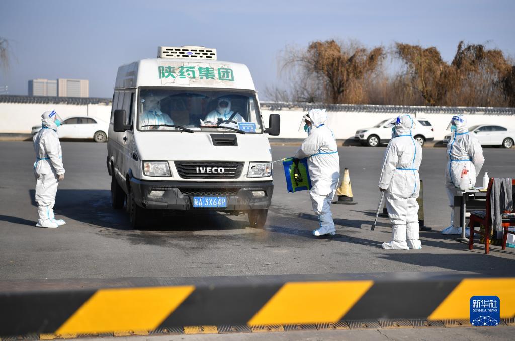 陜藥集團派昂醫(yī)藥公司通過給社會運輸車輛駕駛室貼封條的方式,避免進入園區(qū)的外部車輛人員感染園區(qū)(12月28日攝)。新華社記者 邵瑞 攝