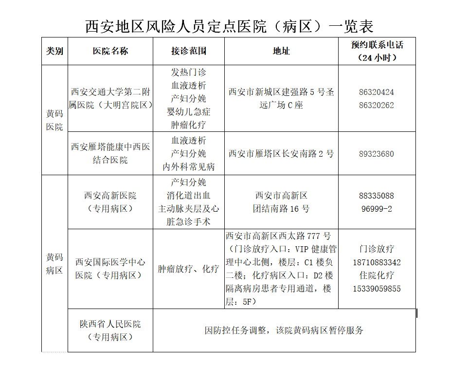 目前,經(jīng)省市協(xié)調(diào),西安地區(qū)已設(shè)立“黃碼醫(yī)院”2家“黃碼病區(qū)”2個(gè)(名單見下表),后續(xù)開設(shè)的“黃碼醫(yī)院”“黃碼病區(qū)”等風(fēng)險(xiǎn)人員定點(diǎn)醫(yī)院(病區(qū))由地市自行發(fā)布。