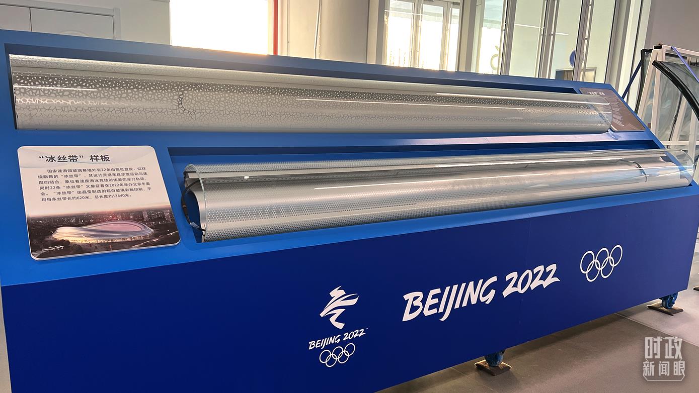△“冰絲帶”由晶瑩剔透的超白玻璃彩釉印刷,平均每條絲帶長(zhǎng)約620米。這是“冰絲帶”樣板。(總臺(tái)央視記者王鵬飛拍攝)