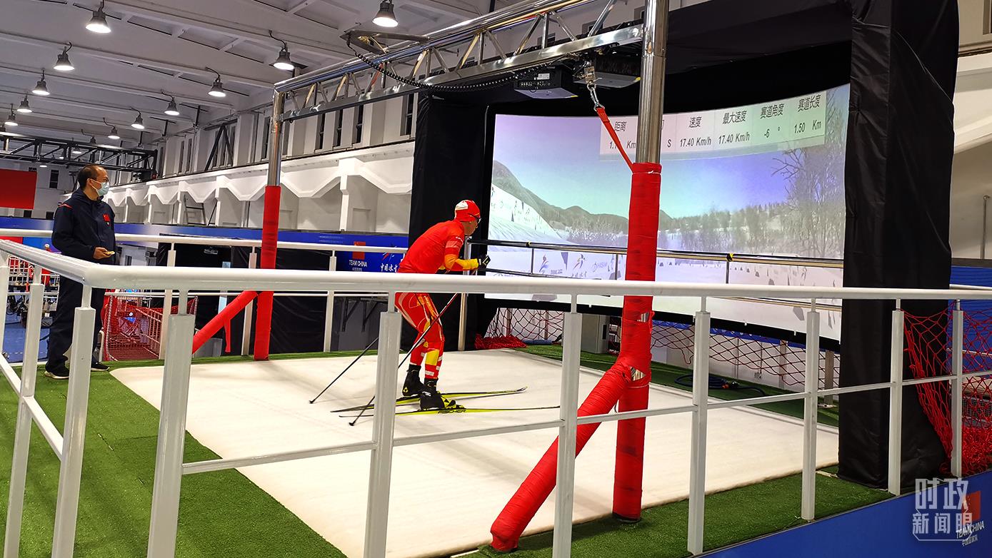 △六自由度一館的多功能訓(xùn)練系統(tǒng),適用滑雪專(zhuān)項(xiàng)訓(xùn)練。運(yùn)動(dòng)員采用真實(shí)雪板和雪杖在沉浸式VR環(huán)境中訓(xùn)練,腳下的雪毯能模擬出雪上滑行的摩擦力感。(總臺(tái)央視記者楊立峰拍攝)