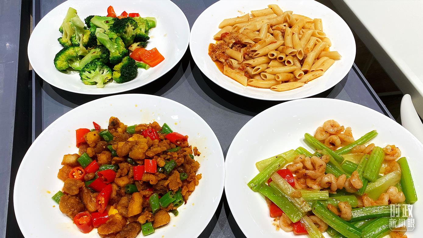 △當(dāng)天機(jī)器人餐廳制作的辣子雞丁、意面等四道美食。(總臺(tái)央視記者張宇拍攝)