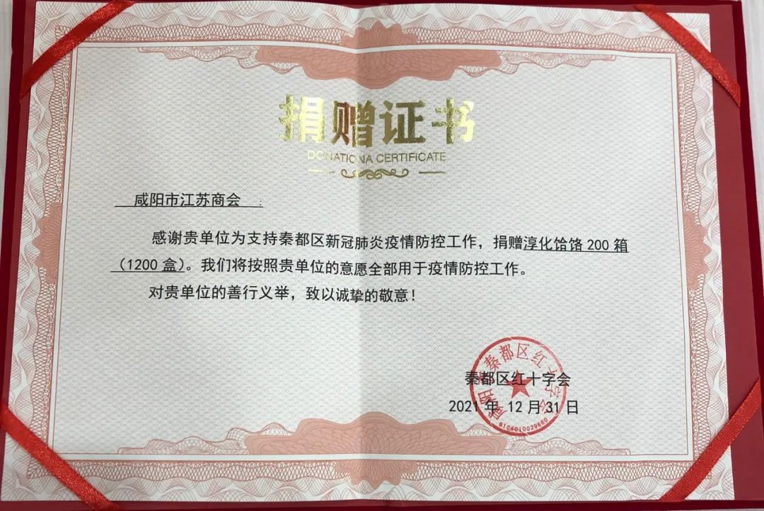 面對新一輪疫情,咸陽市江蘇商會及會員企業(yè)以不同的方式表達對咸陽市一線工作人員的關(guān)懷、對咸陽戰(zhàn)“疫”的支持,展現(xiàn)了一幕幕一心共同抗疫情的感人畫面,充分展現(xiàn)了咸陽市江蘇商會助力抗擊疫情的決心和信心,秦都區(qū)紅十字會向咸陽市江蘇商會頒發(fā)捐贈證書。