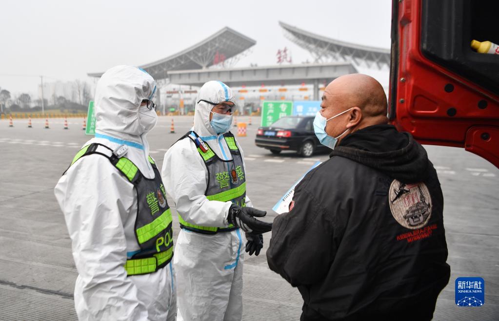 1月10日,西安市公安局交通警察支隊(duì)高新大隊(duì)民警在西安市繞城高速河池寨收費(fèi)站與駕駛員交流。新華社記者 張博文 攝
