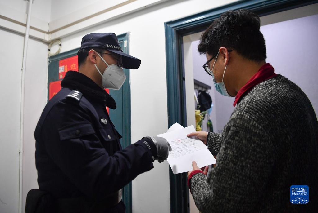 1月10日,西安市公安局浐灞生態(tài)區(qū)分局民警在負(fù)責(zé)執(zhí)勤的社區(qū)向居民講解疫情防控政策。新華社記者 張博文 攝