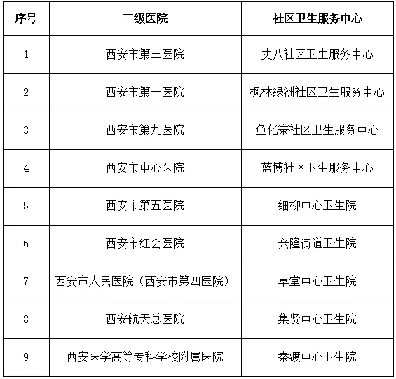 指定市屬三級醫(yī)院9家,對口支援高新區(qū)9個(gè)社區(qū)衛(wèi)生服務(wù)中心(或鄉(xiāng)鎮(zhèn)衛(wèi)生院,下同)(對口支援關(guān)系見附件),簽訂對口支援協(xié)議,下派內(nèi)科、外科、婦產(chǎn)科醫(yī)務(wù)人員駐點(diǎn)社區(qū)衛(wèi)生服務(wù)中心坐診,另外由西安市兒童醫(yī)院、西安市中醫(yī)醫(yī)院向丈八社區(qū)衛(wèi)生服務(wù)中心、楓林綠洲社區(qū)衛(wèi)生服務(wù)中心、魚化寨社區(qū)衛(wèi)生服務(wù)中心、藍(lán)博社區(qū)衛(wèi)生服務(wù)中心派中醫(yī)醫(yī)師和兒科醫(yī)師,確保社區(qū)衛(wèi)生服務(wù)中心能順利開展基本診療工作。高新區(qū)要加強(qiáng)社區(qū)衛(wèi)生服務(wù)中心硬件建設(shè),配備必要的檢查、檢驗(yàn)設(shè)備,確保能夠完成基本醫(yī)療所必需的檢查和檢驗(yàn)項(xiàng)目。支援醫(yī)院與社區(qū)衛(wèi)生服務(wù)中心建立上下轉(zhuǎn)診關(guān)系,對超出社區(qū)衛(wèi)生服務(wù)中心診療能力的轉(zhuǎn)往上級醫(yī)院進(jìn)一步診治,支援醫(yī)院應(yīng)采取預(yù)約門診、綠色通道或預(yù)留床位等方式做好支持。
