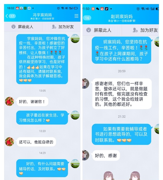 面對家長在抗“疫”一線經(jīng)受的各種考驗,孩子們時刻惦記,情緒起伏較大。班主任和任課老師密切溝通,溫暖陪伴,守護抗“疫”一線工作人員子女的心理健康。通過微信視頻連線、電話等方式與孩子們密切溝通,用質(zhì)樸的話語與孩子們談心,帶去學(xué)校的關(guān)心和溫暖,緩解他們不安的情緒。