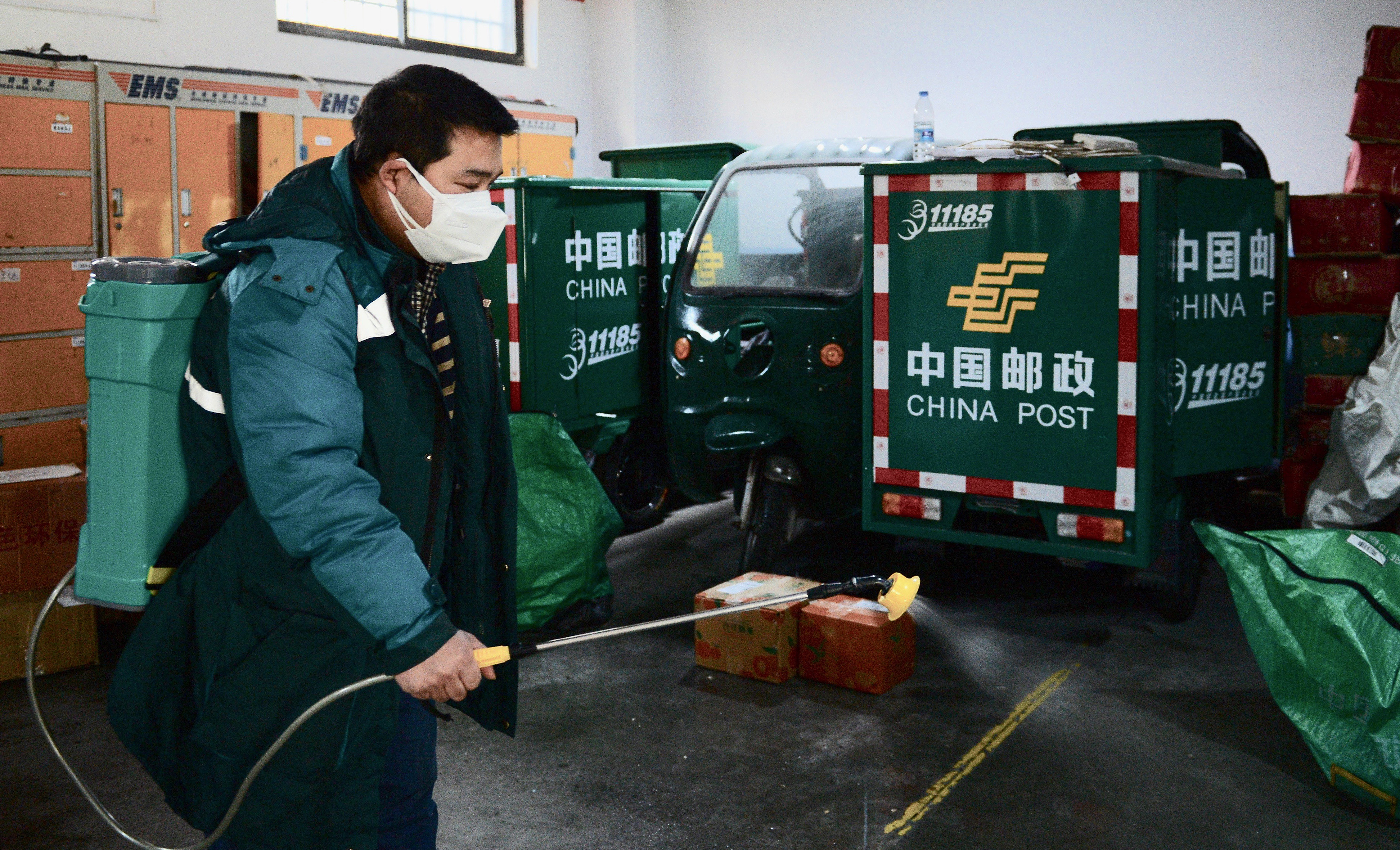 1月13日,中國郵政西安經(jīng)開分公司的員工在對倉庫進行消殺。 新華社發(fā)(鄒競一 攝)