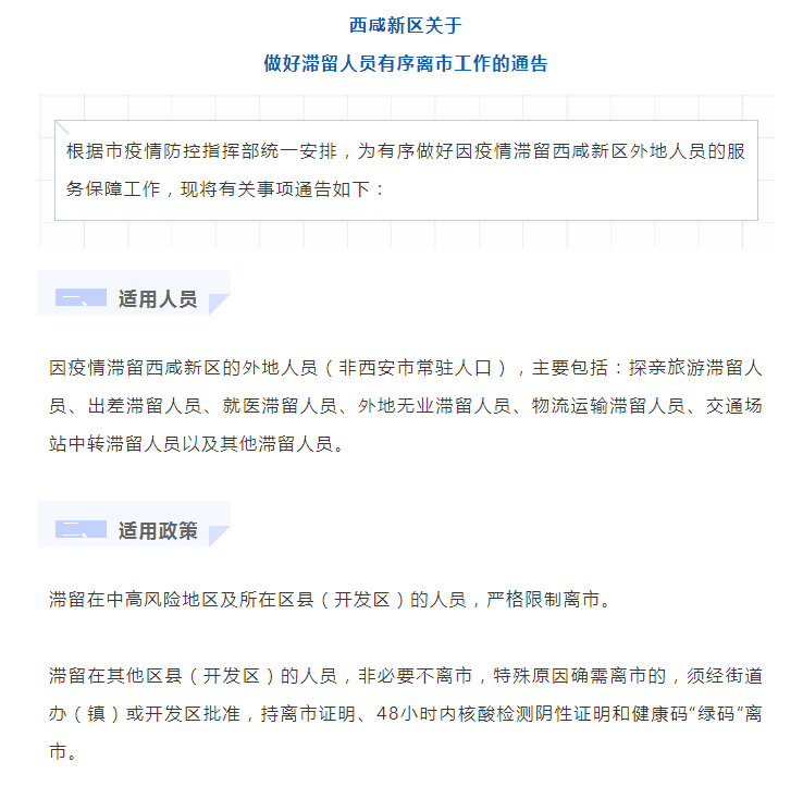 西咸新區(qū)發(fā)布關于做好滯留人員有序離市工作的通告。