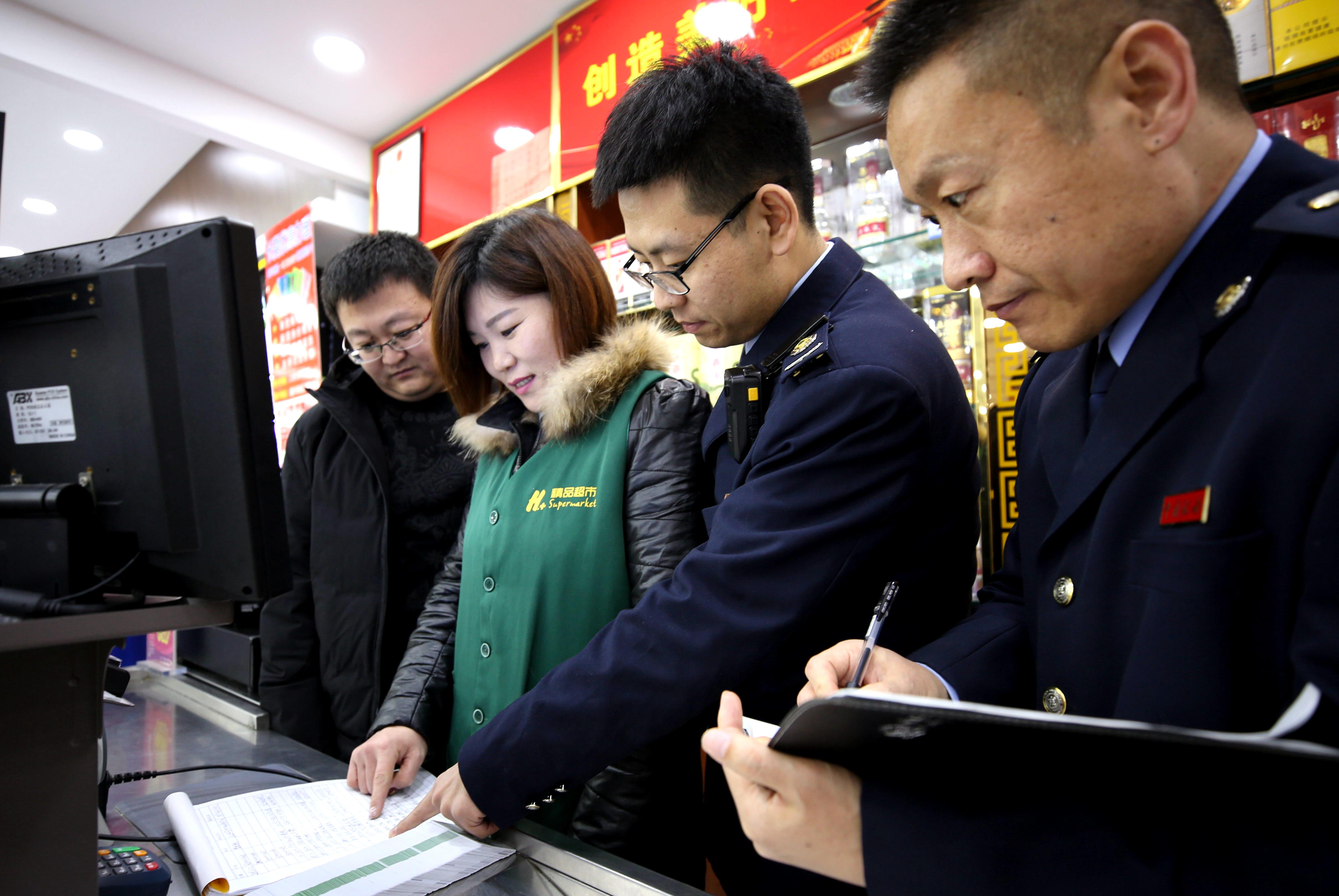 河北大廠回族自治縣紀(jì)檢干部和稅務(wù)部門(mén)稽查人員在一家超市檢查是否有單位公款購(gòu)買(mǎi)購(gòu)物卡情況(2019年1月22日攝)。新華社記者 王曉 攝