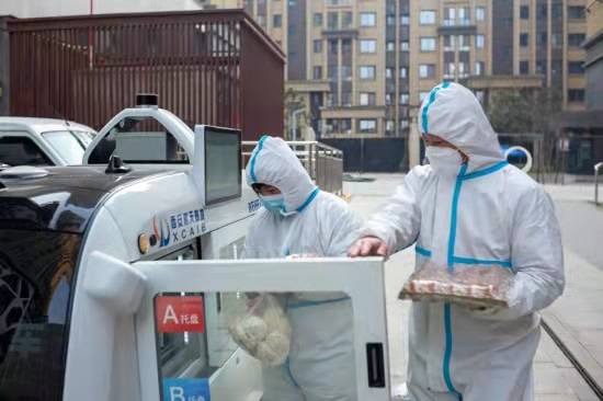 關(guān)好柜門后,白色小車便沿著設(shè)定軌道緩緩駛向附近的鳳鳴小區(qū)。穿著防護服的工作人員早已等候在指定位置,他們打開寫有樓棟號的柜門取出貨物,關(guān)上柜門后,小車又自動駛向下一站……這種科技感十足的配送方式,既提高了效率,又實現(xiàn)了全程無接觸精準配送。