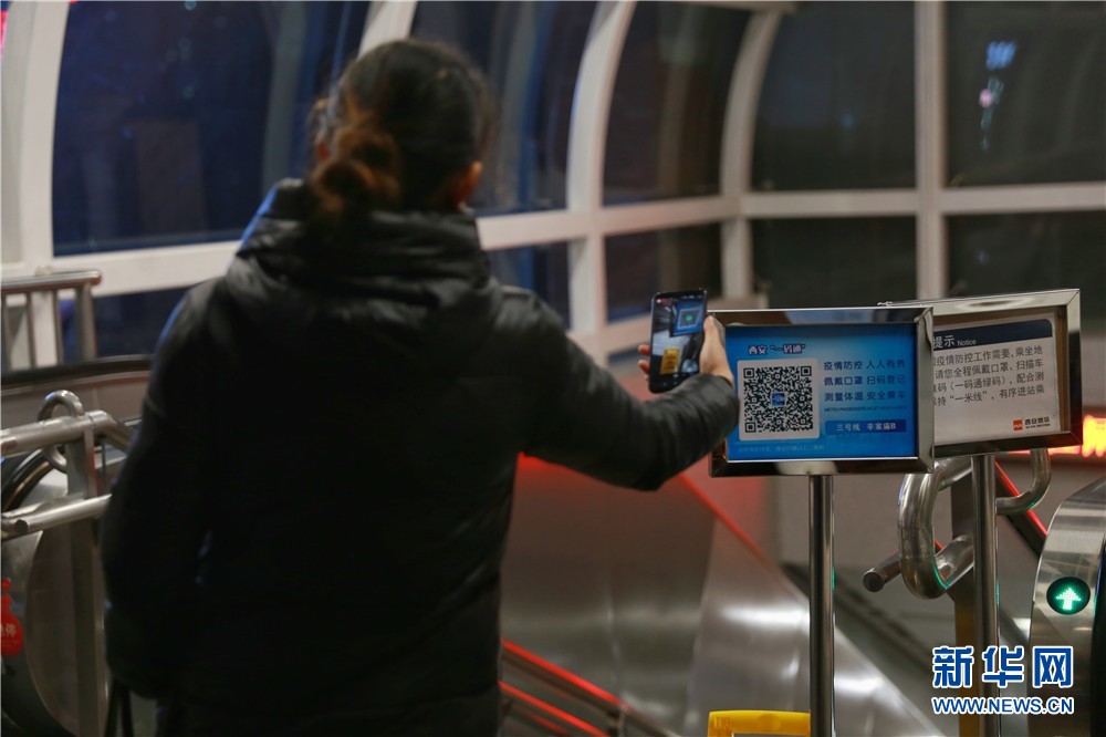 1月25日,西安地鐵三號(hào)線辛家廟站B口,市民在進(jìn)行掃碼登記。新華網(wǎng) 王智超 攝