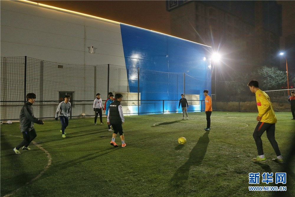 1月25日,在西安市未央?yún)^(qū)一處健身場(chǎng)所,幾名年輕人正在踢足球。新華網(wǎng) 王智超 攝