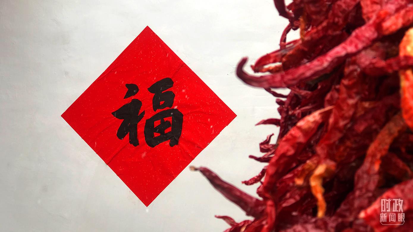 △村民院中晾曬的紅辣椒與福字相映成趣。(總臺央視記者石偉明拍攝)