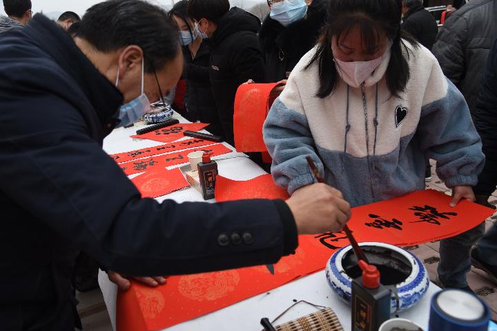 1月24日,厙弆村“三下鄉(xiāng)”現(xiàn)場(chǎng),書法愛好者為群眾書寫春聯(lián)。(新華社記者崔翰超 攝)