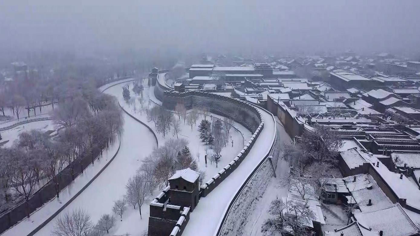 △2022年1月24日,平遙迎來(lái)降雪天氣,整個(gè)古城的輪廓被銀白筆墨勾勒出來(lái)。(總臺(tái)央視記者 范凱拍攝)