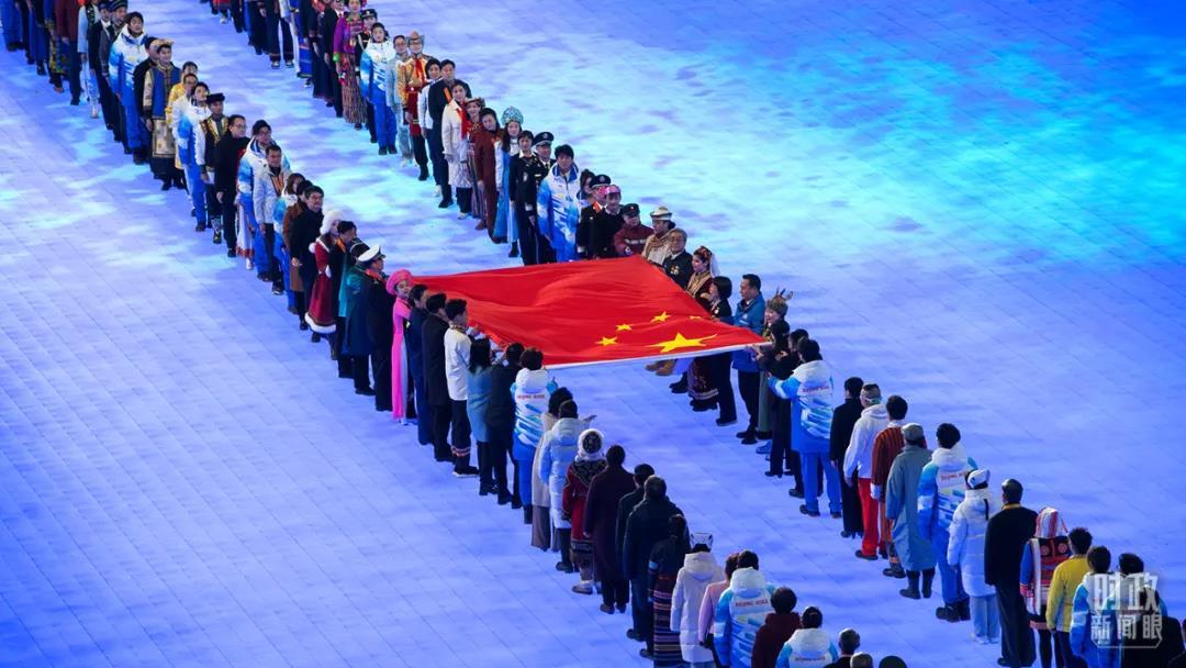 △東道主中國代表團(tuán)入場,兩名持旗手分別是中國鋼架雪車女將趙丹和速度滑冰名將高亭宇。(總臺記者廖江衡拍攝)