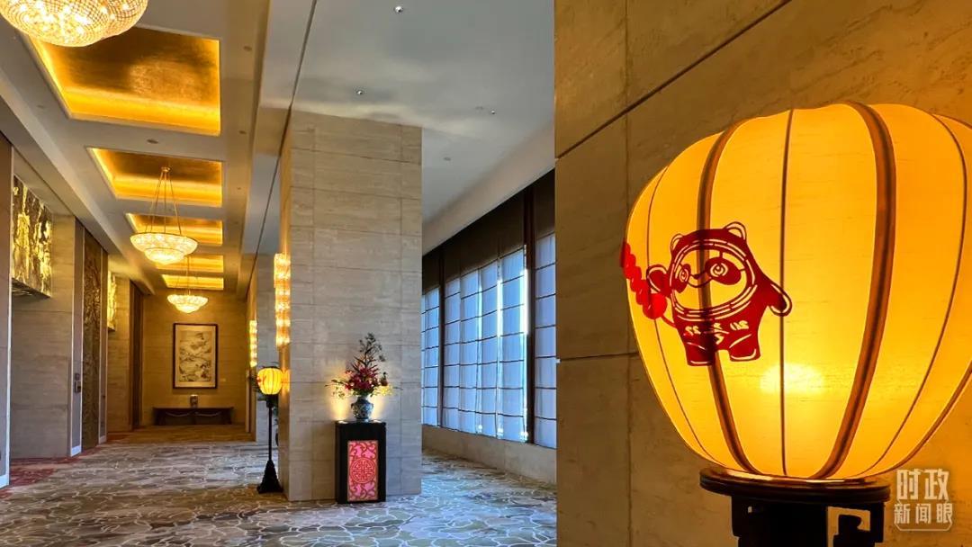 △芳華苑大廳擺放著兩國國旗,國旗后是《六合同春圖》。六合是指天地四方(天地和東南西北),六合同春便是天下皆春,萬物欣欣向榮。(總臺央視記者楊波拍攝)