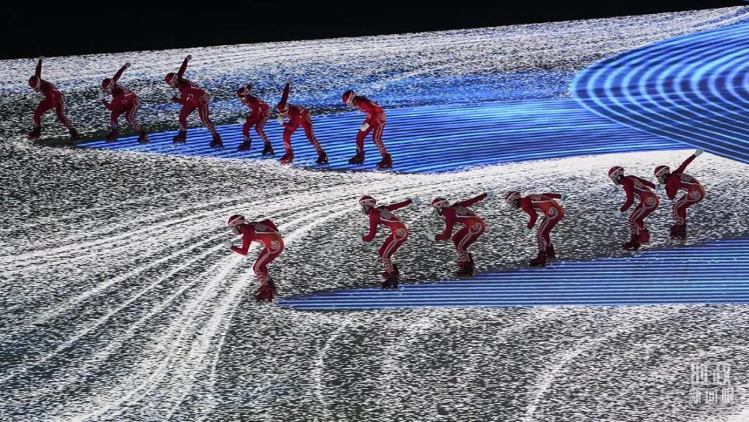 △開幕式上,滑冰運(yùn)動員滑過冰面后,留下長長的軌跡。(總臺國廣記者李晉拍攝)