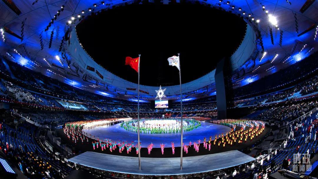 △北京冬奧會(huì)開(kāi)幕式上,6名旗手手執(zhí)奧林匹克會(huì)旗入場(chǎng)。(總臺(tái)記者廖江衡拍攝)