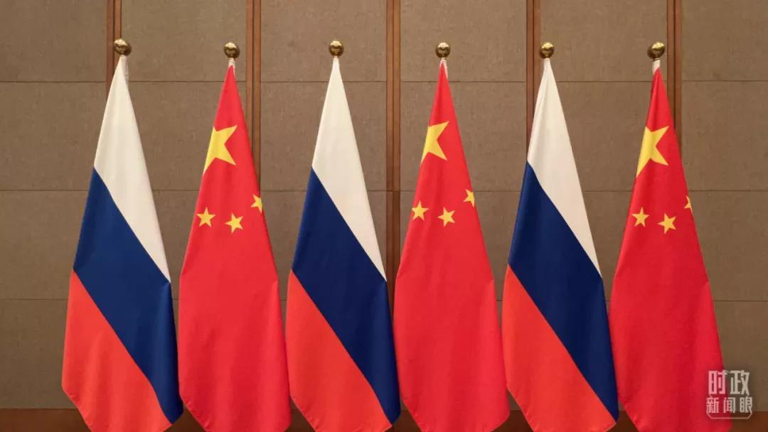 △2月4日,中俄兩國(guó)元首會(huì)談現(xiàn)場(chǎng)的兩國(guó)國(guó)旗。(總臺(tái)央視記者范學(xué)禹拍攝)
