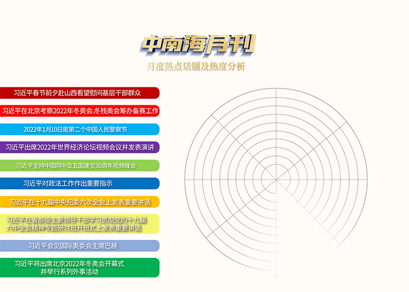 央視網(wǎng)“智聞”系統(tǒng)提取分析2022年1月時(shí)政熱點(diǎn)新聞,總書(shū)記兩赴地方考察、出席2022年世界經(jīng)濟(jì)論壇視頻會(huì)議、主持中國(guó)同中亞五國(guó)建交30周年視頻峰會(huì)等相關(guān)話題備受關(guān)注。