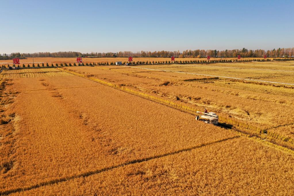 2021年10月12日,在吉林省吉林市永吉縣萬昌鎮(zhèn),農民駕駛農機收割水稻(無人機照片)。新華社記者 張楠 攝