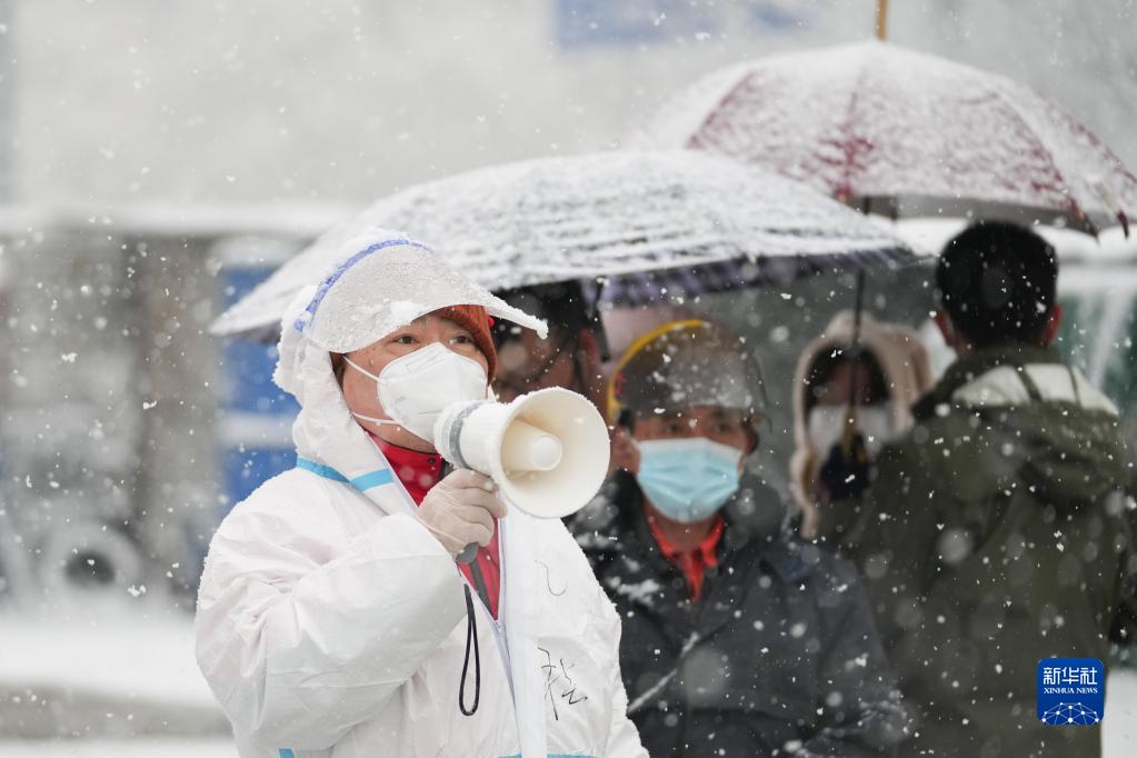 3月18日,在北京市東城區(qū)北新橋街道一處核酸采樣點(diǎn),工作人員冒雪引導(dǎo)前來檢測的居民。新華社記者 鞠煥宗 攝