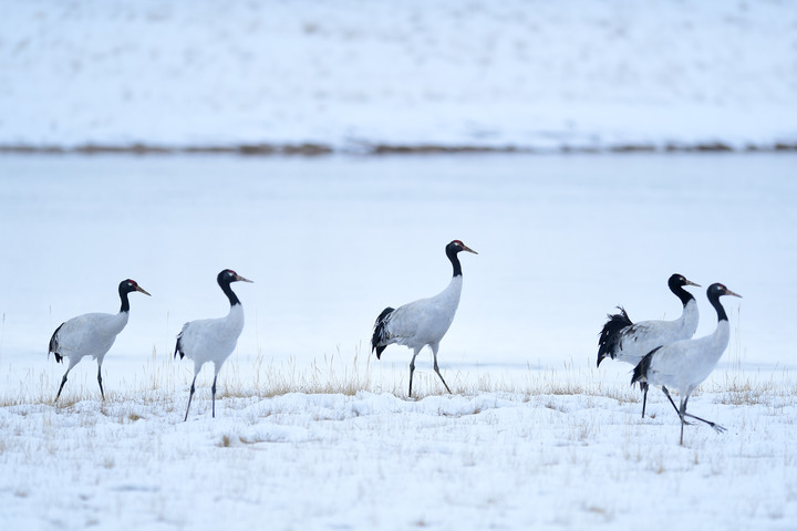 2021年10月21日在三江源國家公園黃河源園區(qū)內拍攝的黑頸鶴。新華社記者 張龍 攝