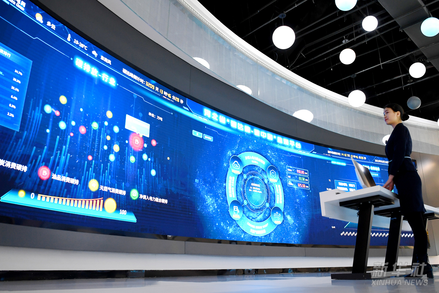 位于雄安新區(qū)首座新建220千伏變電站——劇村站內(nèi)的“碳達峰、碳中和”監(jiān)測平臺,通過電力大數(shù)據(jù)折算碳排放量,對雄安新區(qū)碳排放、碳減排、碳匯進行實時監(jiān)測分析(2022年3月18日攝)。
