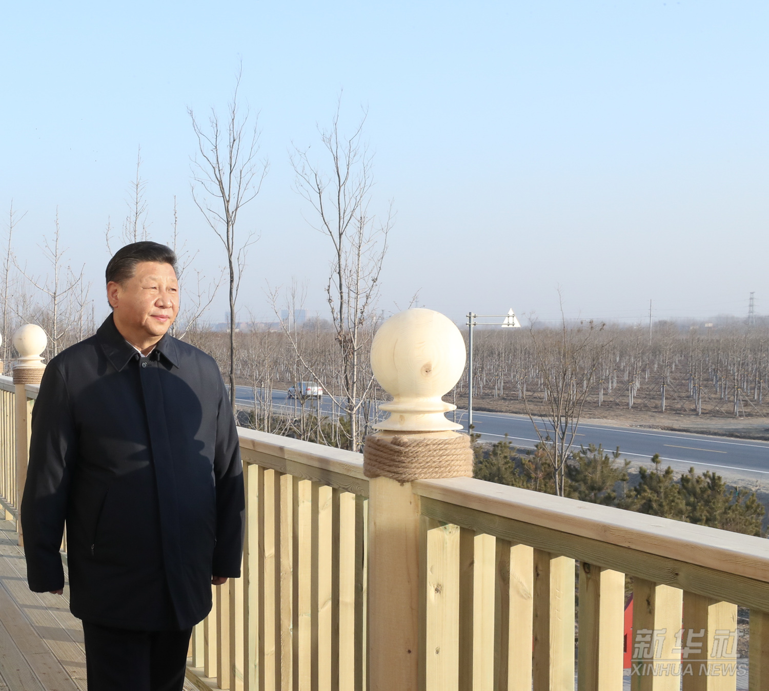 2019年1月16日至18日,習(xí)近平在京津冀考察,主持召開京津冀協(xié)同發(fā)展座談會并發(fā)表重要講話。這是1月16日下午,在雄安新區(qū)“千年秀林”大清河片林一區(qū)造林區(qū)域,習(xí)近平登上秀林驛站二層平臺遠眺林區(qū)全貌。