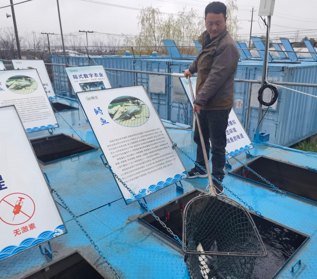 “我們模擬活水循環(huán),采用尾水處理、養(yǎng)殖廢水利用等方式,打造適合魚類生長的環(huán)境,實現(xiàn)全程可控化、標(biāo)準化生產(chǎn)。”良莊農(nóng)業(yè)科技園負責(zé)人陳金良告訴記者,與普通魚塘相比,集裝箱養(yǎng)殖同等數(shù)量的魚,可以節(jié)約土地資源和水資源均在90%以上,“這個智慧漁場有70個集裝箱,一年能產(chǎn)魚約40萬斤。”