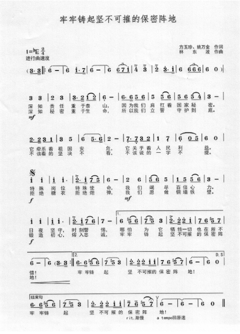 慶祝建黨百年獲獎歌曲作品選集——《牢牢鑄起堅(jiān)不可摧的保密陣地》詞曲。