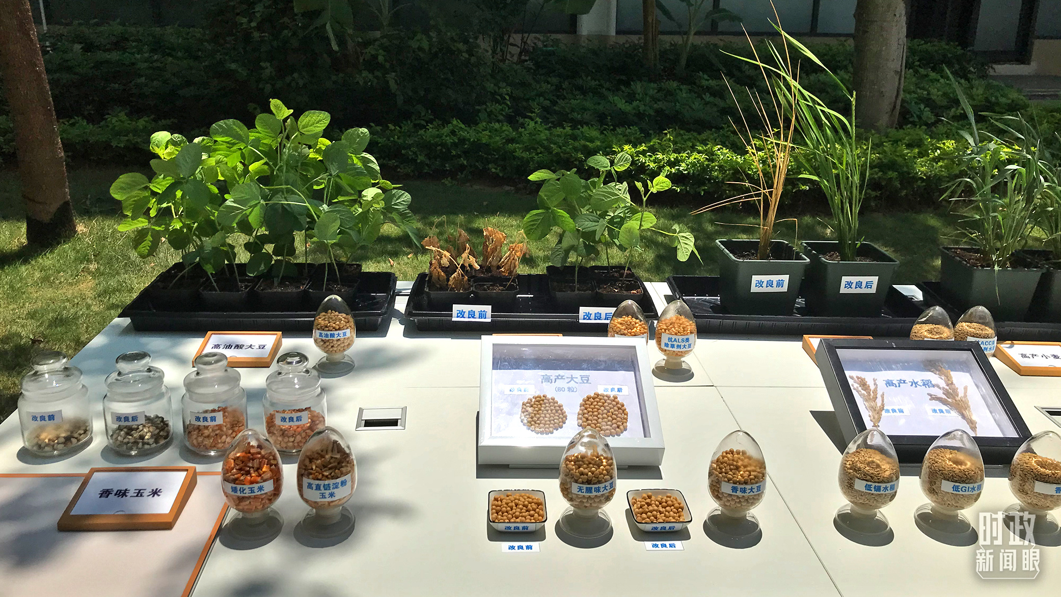 △崖州灣種子實驗室,玉米、大豆和水稻改良前后的對比樣品。(總臺央視記者石偉明拍攝)