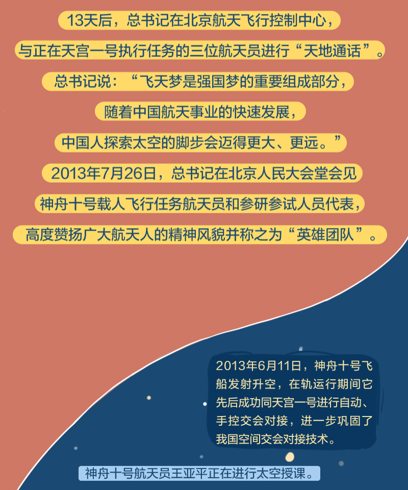 黨的十八大以來,總書記始終高度關(guān)注我國航天事業(yè)發(fā)展,多次同執(zhí)行任務(wù)的航天員展開“天地通話”、給參與“東方紅一號”任務(wù)的老科學(xué)家回信、親切接見航天工作者、深情寄語航天人……