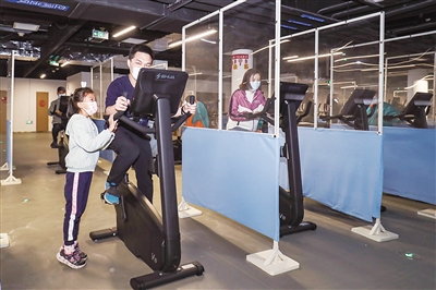 建設(shè)者代表及家屬在冬奧村體驗健身設(shè)施。