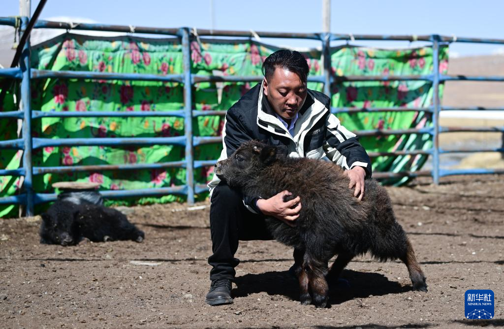 4月20日,在青海省玉樹藏族自治州曲麻萊縣,牧民在查看牛犢生長情況。