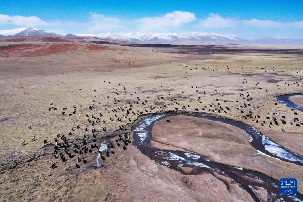 4月20日,在青海省玉樹藏族自治州曲麻萊縣,牦牛在草原上覓食(無人機照片)。