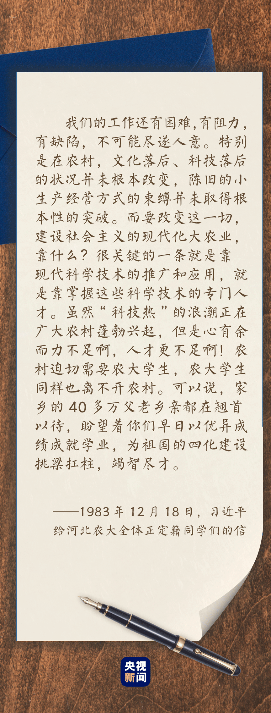 “習書記的來信有兩點對我們觸動很大。一是習書記非常謙虛,信里說‘過去對你們一直關心未及,深感抱歉,望得到諒解’‘這里我想高興地向大家報告’,特別是信的末尾署名是‘你們的同志習近平’,一下子就拉近了我們之間的距離,現(xiàn)在回憶起來仍然對這個落款印象深刻。二是習書記在信中說‘農(nóng)村迫切需要農(nóng)大學生’‘家鄉(xiāng)的40多萬父老鄉(xiāng)親都在翹首以待’,讓我們感受到‘挑梁扛柱’的責任,增添了‘奮發(fā)圖強’的力量,激發(fā)了‘獻身四化’的決心。”