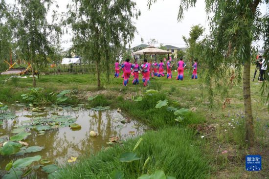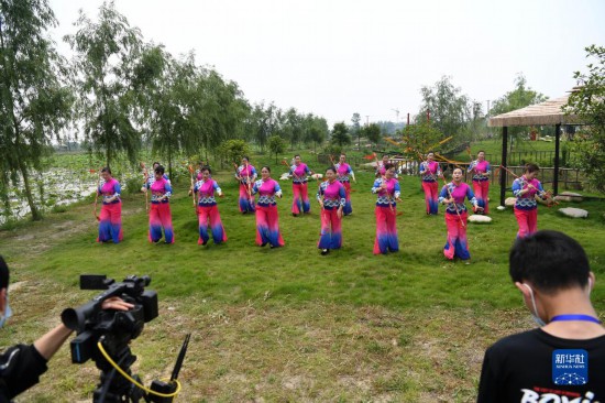 5月15日,肥西縣柿樹(shù)崗鄉(xiāng)村民通過(guò)“云上”直播表演當(dāng)?shù)貍鹘y(tǒng)非遺文化項(xiàng)目蓮湘舞。新華社記者劉軍喜攝