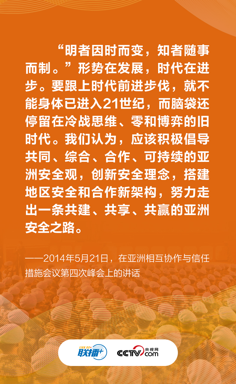 作為負責任的大國,中國一直為維護世界和平、安寧與發(fā)展不懈努力。2014年5月21日,為促進亞洲和平發(fā)展,習近平主席在亞洲相互協(xié)作與信任措施會議第四次峰會上提出踐行共同、綜合、合作、可持續(xù)的亞洲安全觀。此后,他在諸多國際場合多次倡導并不斷發(fā)展“共同、綜合、合作、可持續(xù)的安全觀”,為世界指引一條通往持久和平的康莊大道。央視網(wǎng)《聯(lián)播+》與您一起學習。