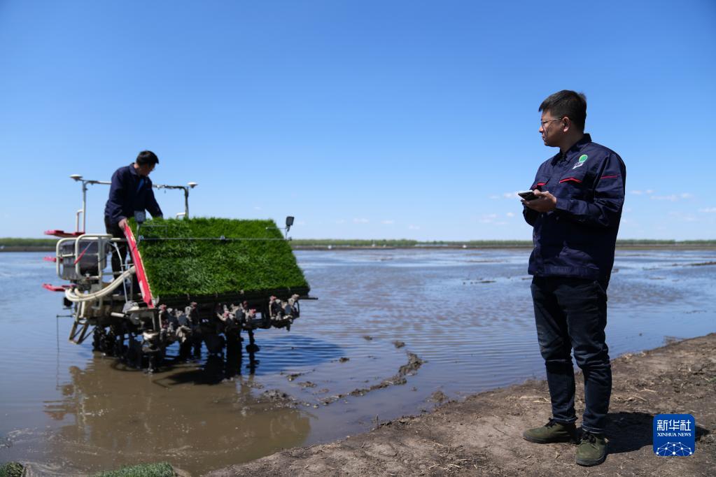 在北大荒集團建三江分公司七星農(nóng)場有限公司萬畝稻田邊,農(nóng)機手陸向?qū)нB續(xù)輕觸兩下手機,一臺帶有北斗導航系統(tǒng)的無人駕駛插秧機開始作業(yè)。