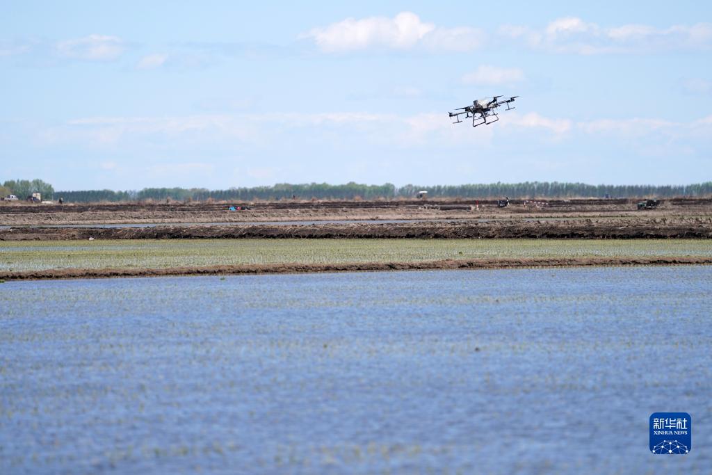 無人機在北大荒集團七星農(nóng)場有限公司一塊稻田中作業(yè)(5月18日攝)。新華社記者 王建威 攝