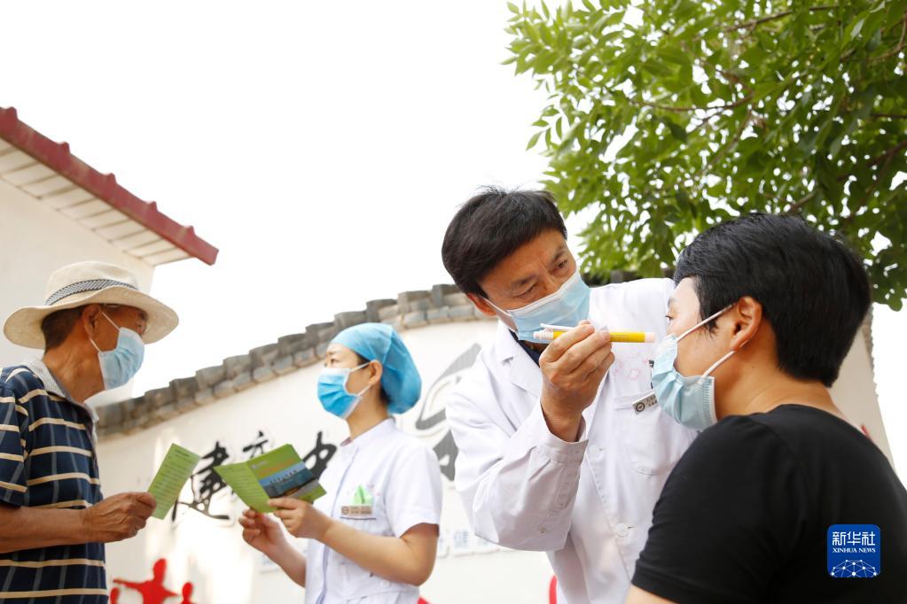 6月5日,河北省邢臺市南和區(qū)人民醫(yī)院醫(yī)務(wù)人員深入鄉(xiāng)村開展基層義診活動,為賈宋鎮(zhèn)蘇史張村村民檢查眼睛。新華社發(fā)(張馳 攝)